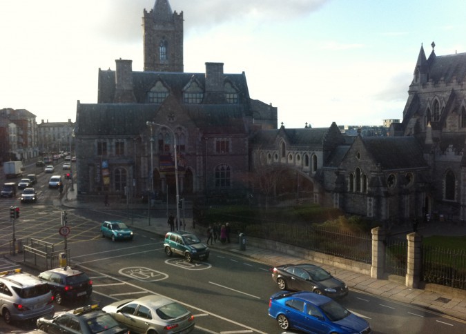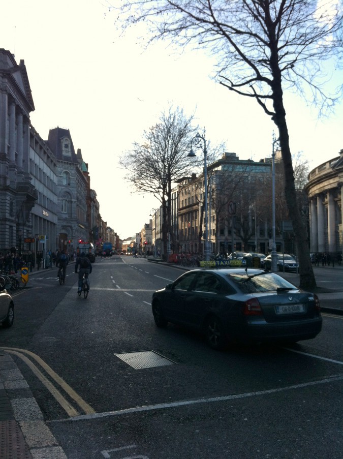 The view up Dame Street (a pretty major drag that changes names about 5 times) from outside Trinity College.
